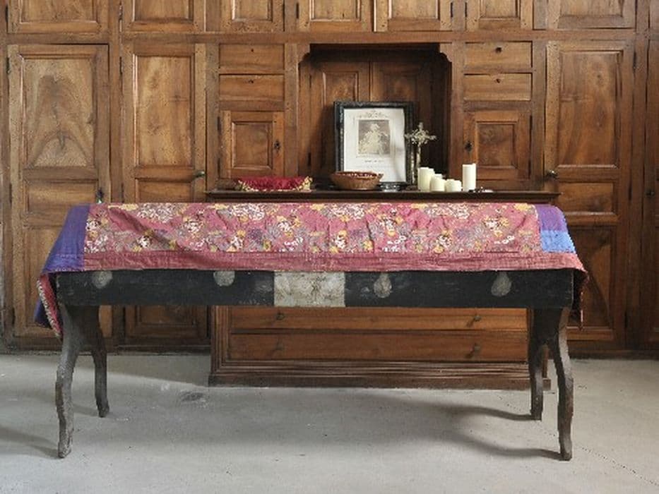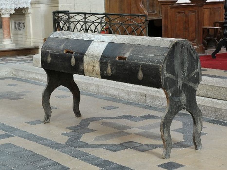 L'appellation "catafalque", qui désigne un meuble destiné à l'exposition d'un cercueil ne paraît pas tout à fait adaptée à l'objet de Montcarra. Il pourrait de toute évidence s’agir d’un élément mobilier à usage funéraire plus communément dénommé « mort en bois » prenant la place du défunt lors de cérémonies commémoratives. Ce meuble de facture simple est pour le moins insolite. En forme de grand coffre étroit, percé de quatre poignées, il repose sur ses extrémités, évidées en forme de double pied incurvé. Cet objet ressemble par sa forme à un cercueil. La couleur noire est de toute évidence associée au deuil renforcé par des motifs blancs : aplat blanc sur la partie supérieure (évocation d’un linceul ? motif crucifère se poursuivant sur les côtés ?), semis de larmes, ossements associés à une tête de mort, autant d’éléments qui confirment un usage funéraire. Ce meuble était recouvert d’un tissu en soie broché.