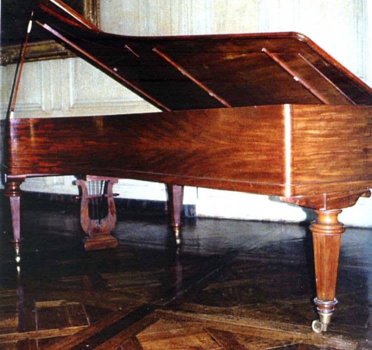 L'étendue du clavier de ce piano est de Do° à La/6. La table porte deux chevalets, avec croisement do dièze/rél. Les premières cordes, une par note, sont filées de do° à fa°; suivent des cordes doubles jusqu'au do dièze, puis 3 cordes par choeur, tout au long.