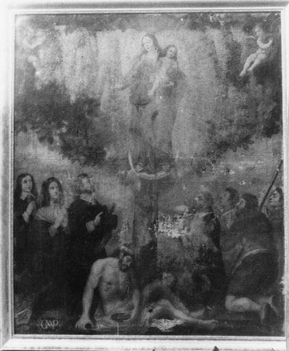POP | Plateforme ouverte du patrimoinetableau ex-voto : Vierge à l'Enfant dans une gloire apparaissant à trois bourgeois, cinq villageois, et un paralytique