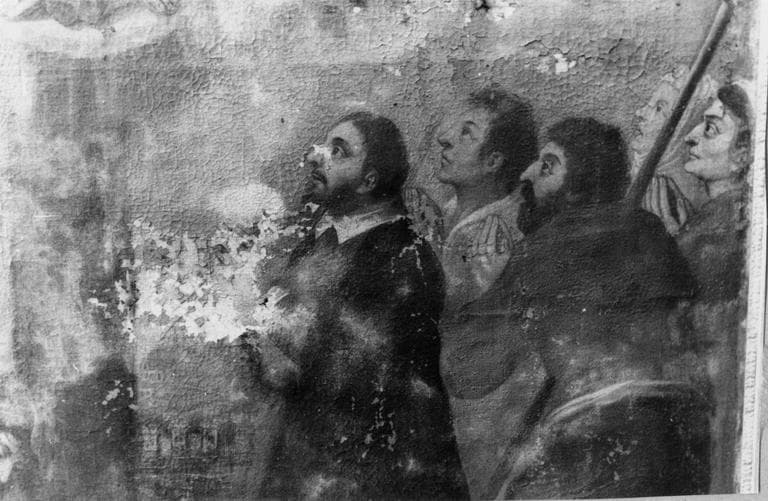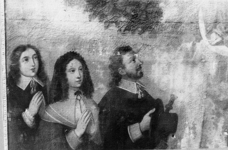 tableau ex-voto : Vierge à l'Enfant dans une gloire apparaissant à trois bourgeois, cinq villageois, et un paralytique