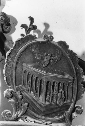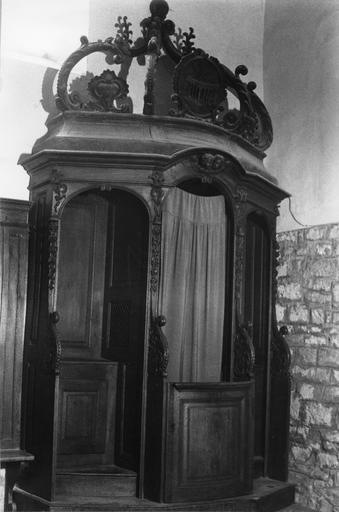 Le confessional comporte un médaillon sculpté en bas-relief représentant la Guérison du paralytique de la piscine probatique.