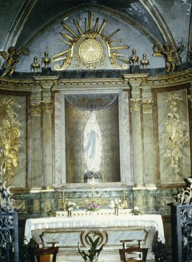 L'autel est en pierre, et le retable est en bois sculpté, en partie doré.