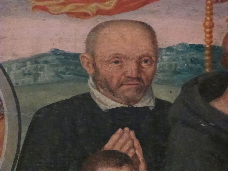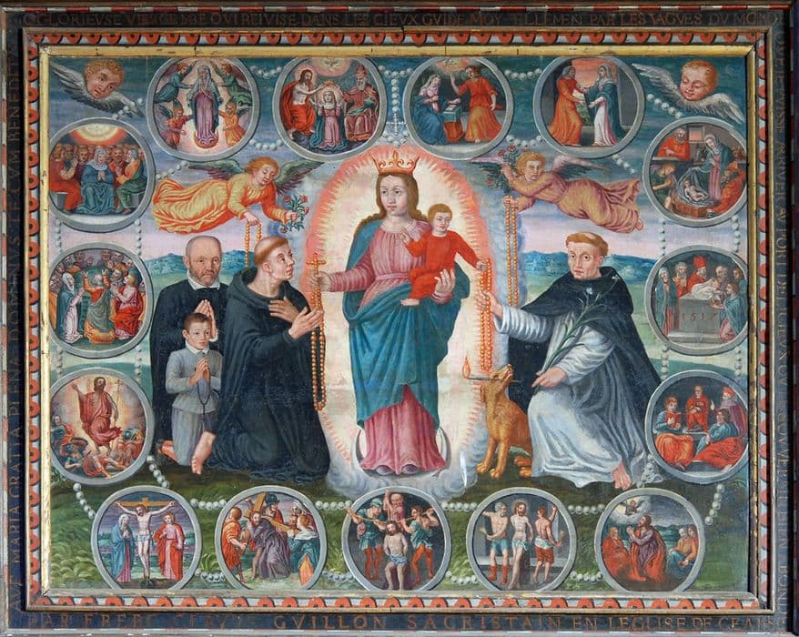 tableau, cadre : La Vierge du rosaire avec saint Dominique, saint Bernard, le donateur et son fils