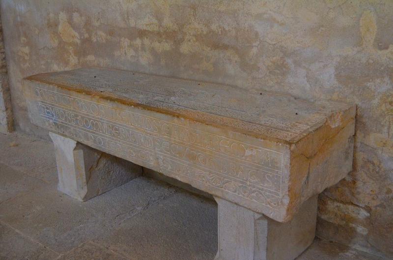 Inscription (latin) : XVI Kalendas octobr obiit Rainaldus venerabilis heremita Tempore Domini Bernardi secundi abbatis Anno mil C IIII (trois lignes en majuscules onciales et romaines).