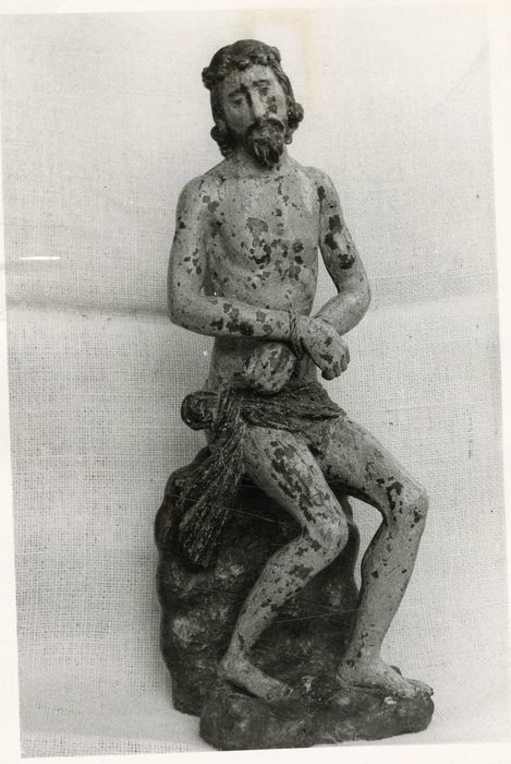 Description du catalogue d'exposition, Dijon, 1971, n° 25 : Le Christ nu est assis, les genoux fléchis, sur une banquette rocheuse, son perizonium laissant pendre sur le côté un grand pan d'étoffe. Les jambes qui se présentent de profil donnent une impression d'instabilité ; les avant-bras repliés sont liés aux poignets. Le Christ incline la tête sur le côté d'un air douloureux. Statuette de dévotion tardive, s'écartant des modèles gothiques'.