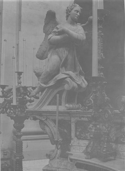 2 statues d'anges adorateurs de part et d'autre de l'autel ; gloire et angelots sur la porte du tabernacle et sur la face antérieure du dôme du baldaquin.