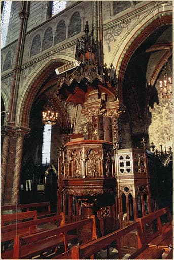 mobilier néogothique : chaire à prêcher, deux confessionnaux, un banc d'oeuvre, deux sièges de célébrants, un lutrin