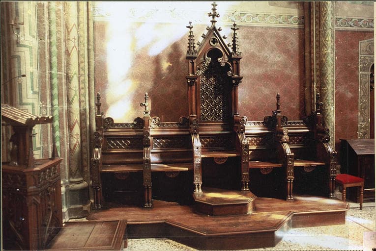 POP | Plateforme ouverte du patrimoinemobilier néogothique : chaire à prêcher, deux confessionnaux, un banc d'oeuvre, deux sièges de célébrants, un lutrin
