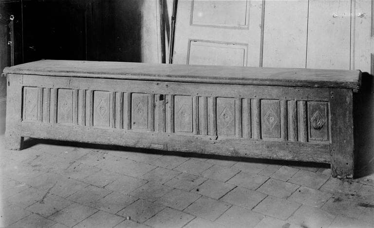 Ouvrage de chêne, de construction rustique, présentant sur sa face antérieure huit panneaux décorés chacun d'un losange de feuillages dans le style de la Renaissance. La serrure a disparu.