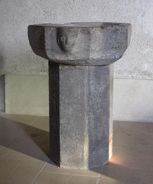 Cuve hexagonale. Sur la face antérieure, tête sculptée, polie par le frottement, d'un assez beau caractère.