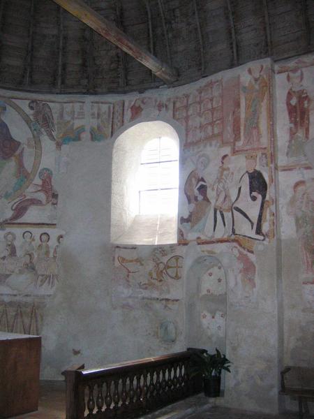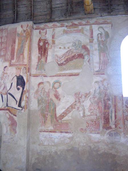 peintures monumentales : la Crucifixion, le Christ en majesté, la Cène, saint Georges, saint Augustin, la Décollation de saint Jacques, la Résurrection de Lazare, la Légende de saint Nicolas, le Paradis, les Limbes et l'Enfer, la Nativité, le Massacre des Innocents