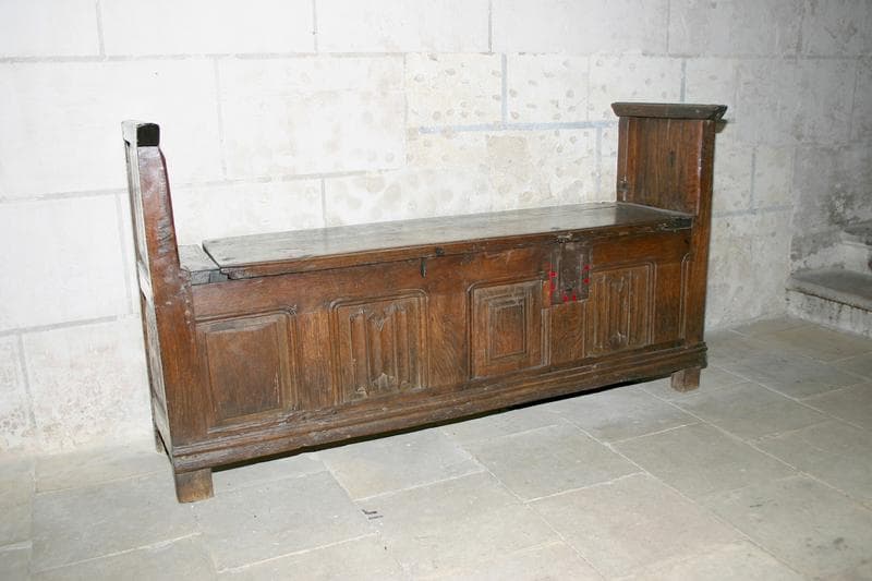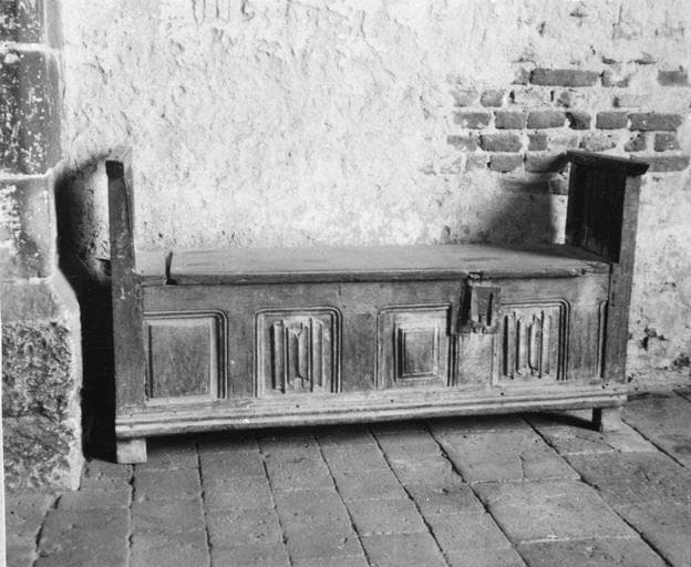 Coffre formant banquette. Accoudoir à chaque extrémité. La face antérieure présentant quatre panneaux dont deux ornés de serviettes parait avoir été rognée dans sa longueur. Serrure ancienne.