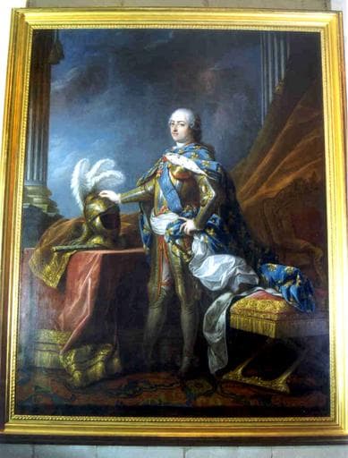 Grand portrait de Louis XV en costume militaire, drapé du manteau fleurdelisé.