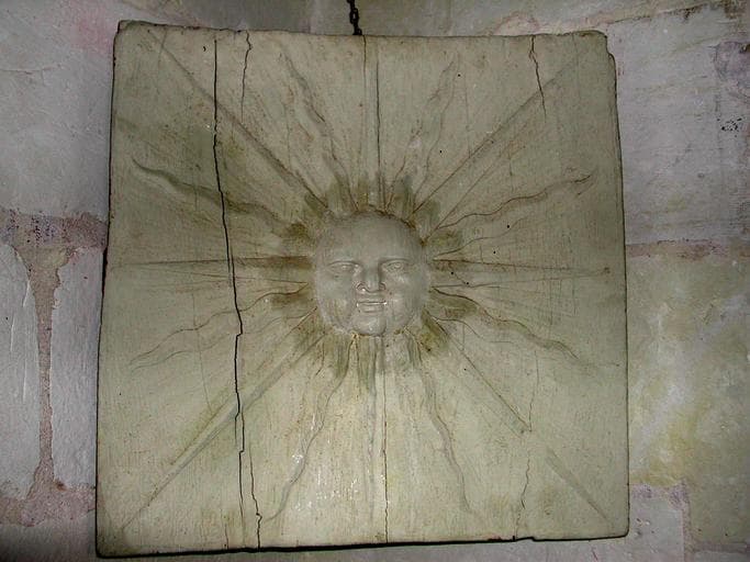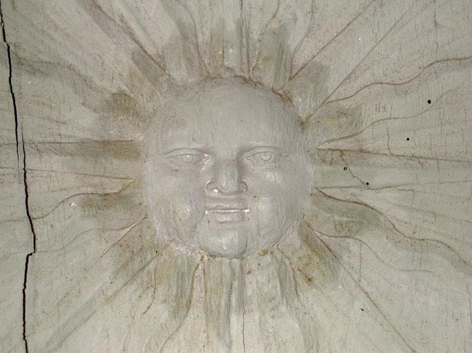 Panneau sculpté d'un soleil à visage humain, environné de rais et de rayons de Saint-Bernardin.