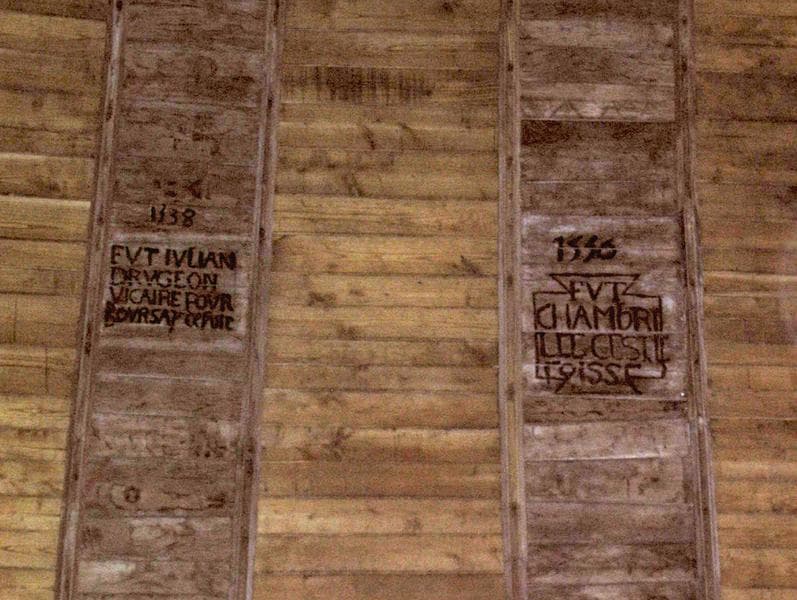 Lambris orné d'arabesques peintes et d'inscriptions. Les poutres sont ornées de têtes de monstres.