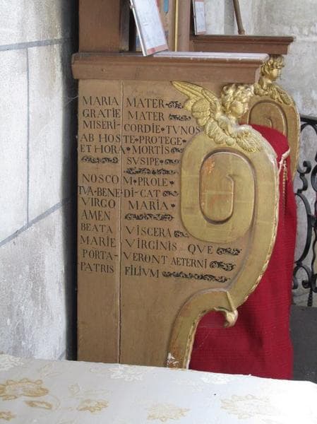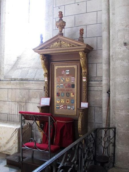 Siège à dossier haut et deux parcloses, le tout surmonté d'un dais en fronton ; prie-Dieu à l'avant.