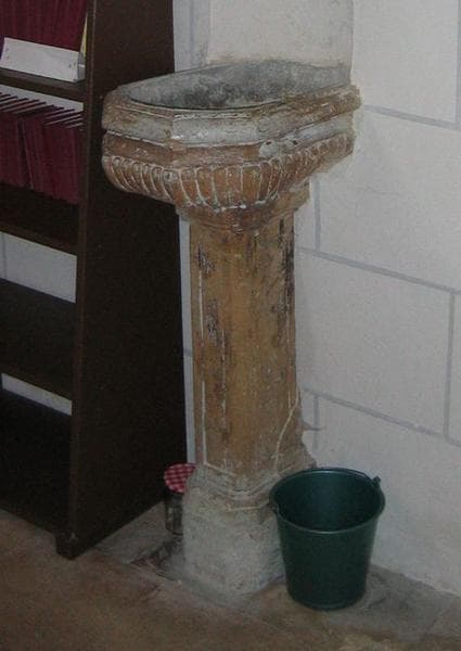 Bénitier sur pied dont la cuve octogonale est similaire à celle des fonts et scellée dans le mur.