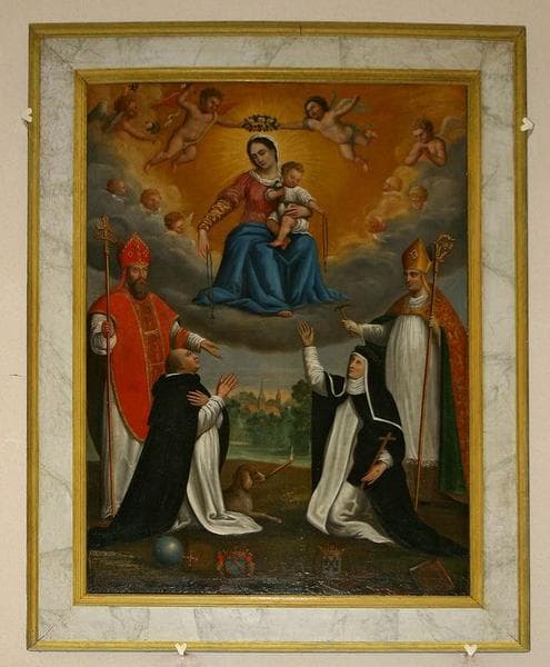 Vierge à l'Enfant, don : rosaire, saint Dominique de Guzman, sainte Catherine de Sienne, chien : torche, saint Sulpice, saint Eloi, fond de paysage : église