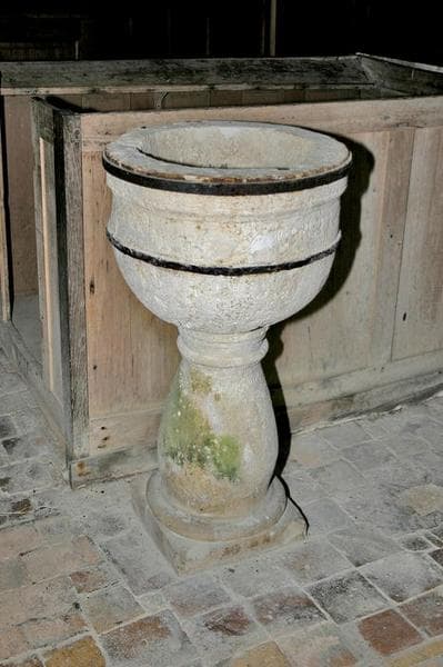 Vasque en pierre avec inscription.