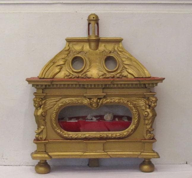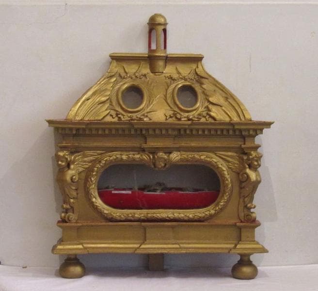 Un reliquaire coupé en deux dans le sens de la longueur.