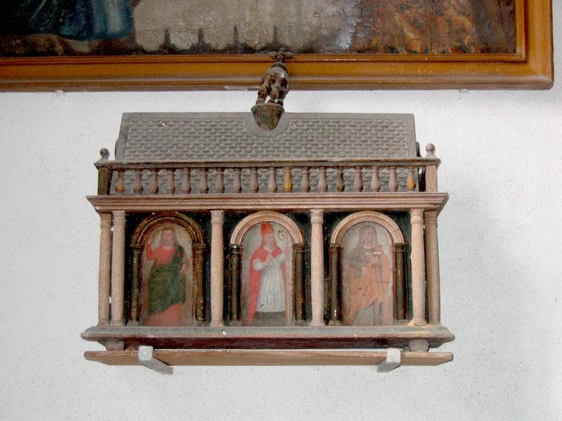 Châsse en forme de maison à deux pans surmontés d'un clocheton au centre du faîtage ; le grand côté est composé de trois arcades séparées par des colonnettes, sous chaque arcade est peint sur le bois un personnage : évêque, saint et sainte ; le toit est ceint d'une balustrade.
