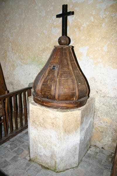 La cuve octogonale est surmonté d'un couvercle en dôme sur lequel est posée une croix.
