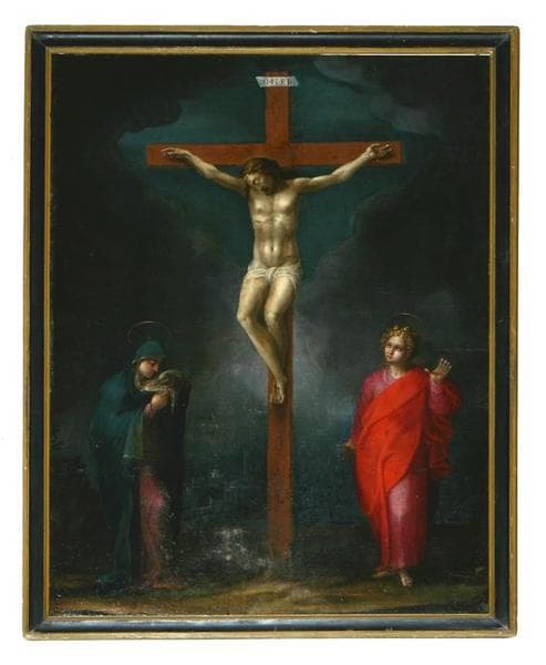 tableau : Christ en croix entre Vierge et saint Jean ou Calvaire