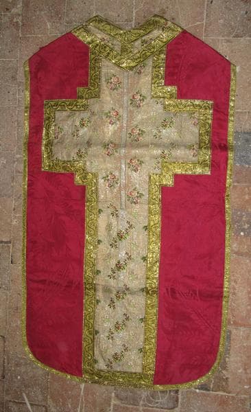 Lampas broché cramoisi avec orfrois fond blanc décor floral.