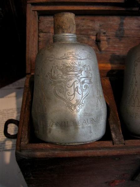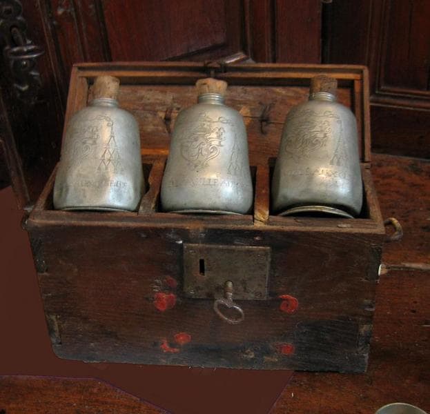 Flacons en fer blanc gravés dans un coffret en bois.