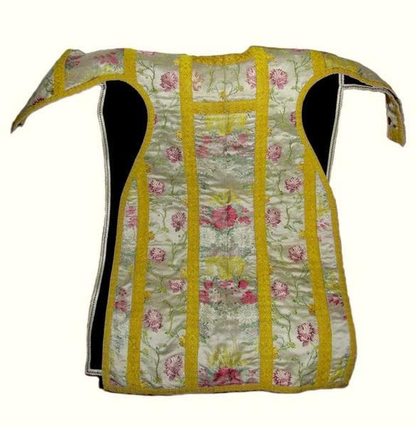 Dalmatique avec décor floral sur fond de satin blanc, remontée recto verso avec une autre tissu de velours noir.