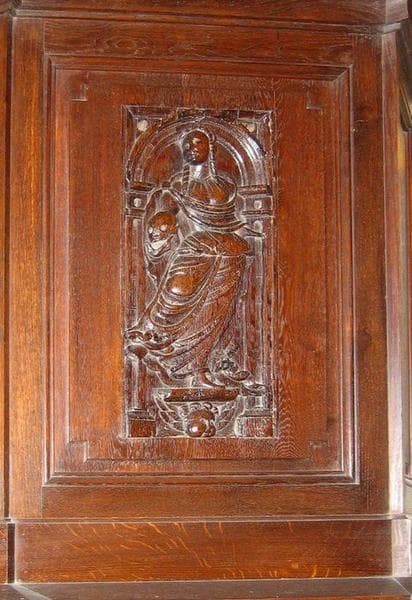 Le panneau sculpté est intégré au fût de la chaire à prêcher.
