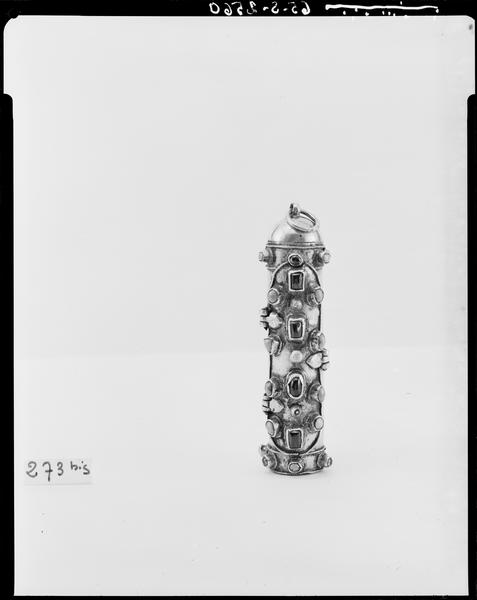 Etui cylindrique en argent doré, plat à la base, et fermé au sommet par une calotte sphérique. A chaque extrémité, une virole est garnie de trois turquoises et de trois grenats alternés. Un volet à charnière protège la monstrance. Il est chargé de grenats, perles et turquoises.