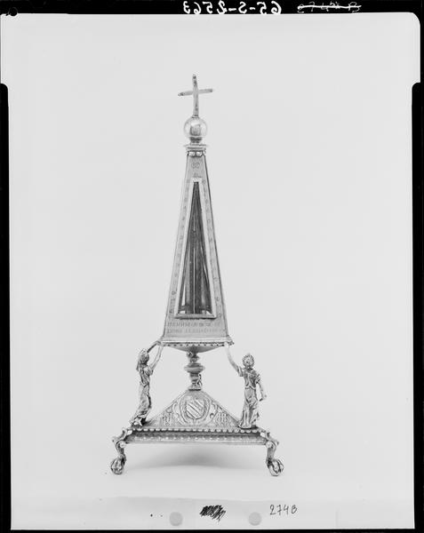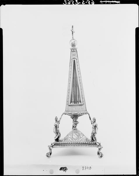 Ce reliquaire est en forme de pyramide à trois pans, surmontée d'une corix. Le pied est élevé sur trois griffes. A chaque angle, un petit personnage se tient debout. Chaque face de la pyramide est ajourée d'une ouverture triangulaire vitrée.