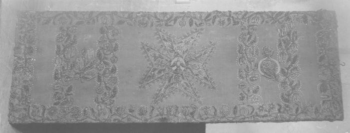 Ce parement d'autel est en laine blanche brodé au plumetis de soie de diverses couleurs.