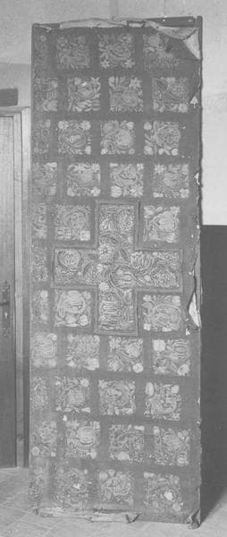 Ce parement est constitué de 39 petites pièces de broderie au plumetis à peu près carrées, représentant des fleurs ; elles sont entourées par des bandes d'étoffe noire. Au milieu, une croix grecque renferme, dans une bordure noire, un plus grand morceau, en forme de croix, de broderie semblable.