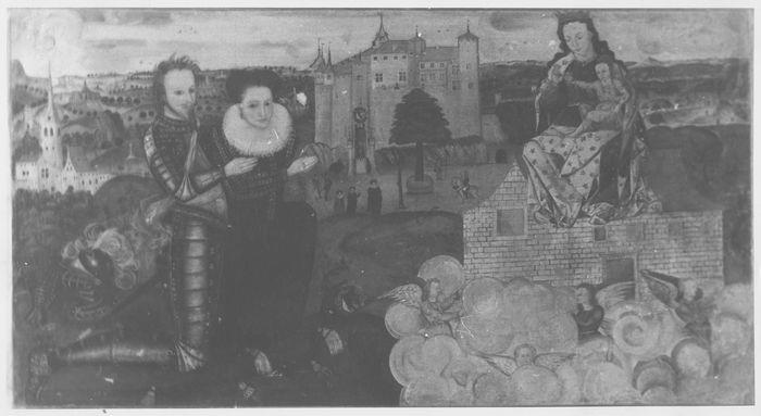 POP | Plateforme ouverte du patrimoinetableau : Alexandre Capponi et son épouse Françoise d'Ogerolles face à une chapelle votive, en mémoire de l'assassinat en 1584 d'Anthoine et Jean d'Ogerolles par Aymard de Saint Priest et son fils