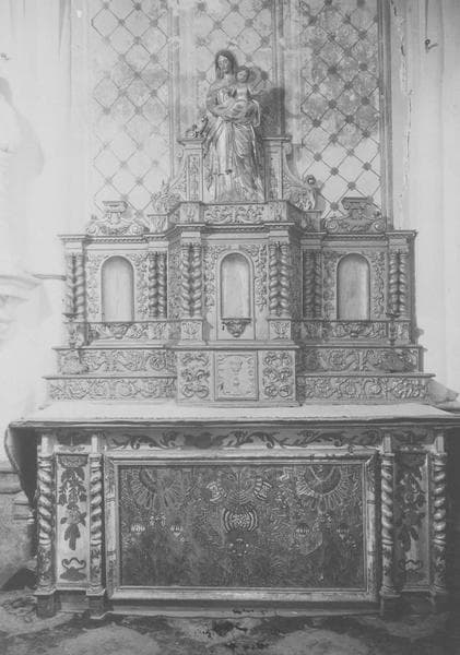 L'autel est en bois peint en blanc et décoré de guirlandes polychromes. La paroi de devant porte au centre un cuir gaufré, teint et doré, dit cuir de Cordoue. Le retable est entièrement doré. La partie centrale, légèrement en saillie, montre, en bas, la porte du tabernacle. Au dessus se trouve une niche (vide), entourée de chutes de feuilles entre deux groupes de deux colonnes torses. Le couronnement supporte une Vierge (qui primitivement ne faisait pas partie de ce retable) placée devant un panneau décoré de fleurs de lys entre deux pilastres. De chaque côté de cette partie centrale, au dessus de deux gradins, une niche (vide) est entourée de chutes de feuilles entre deux groupes de deux colonnes torses. Une corniche fait le couronnement. Au dessus de celle-ci, deux volutes opposées supportent un piédestal qui paraît avoir porté une pomme cotelée.