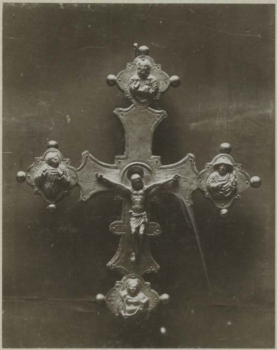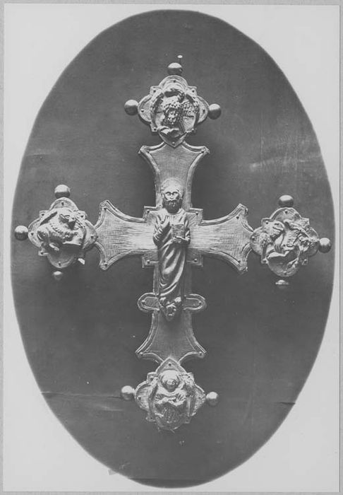 Cette croix est décorée au revers d'une figure d'Evangéliste. Elle est composée d'éléments d'époques distinctes. La croix elle-même, en bois doré, paraît être du 17e siècle. Des éléments du 15e ou du 16e siècle y ont été ajoutés postérieurement.