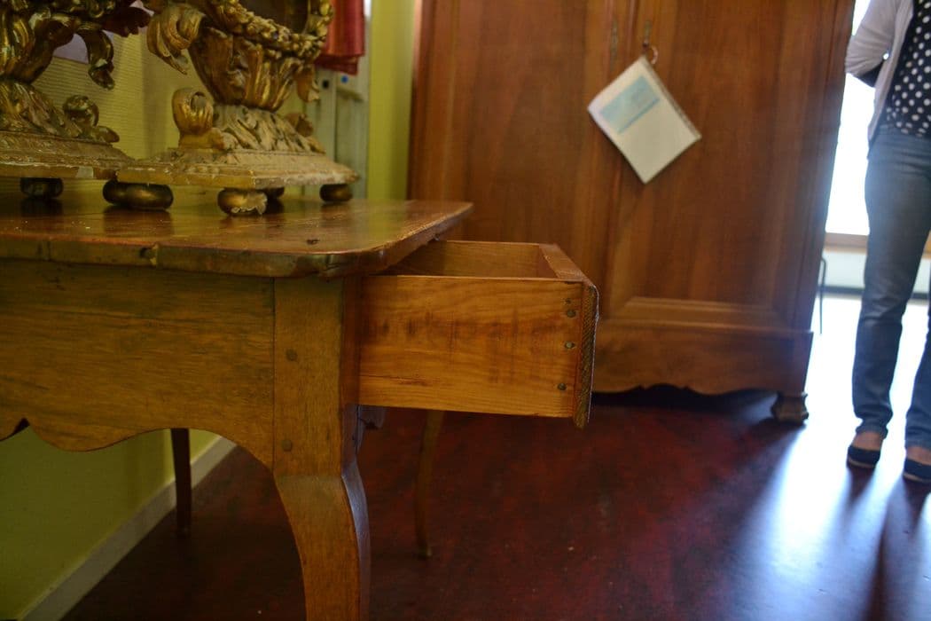 Table Louis XV à pieds cambrés et deux tiroirs.