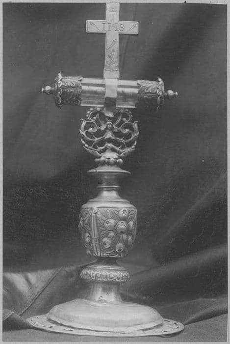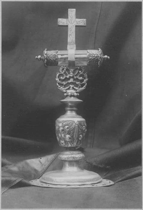 Reliquaire avec monstrance horizontale surmontée d'une croix. La partie extérieure du pied est formée d'une lame d'argent en forme de disque. Le croisillon est formé d'un tube de cristal contenant les reliques. Il est fermé à chaque extrémité par un dé en argent. Le croisillon vertical est lui-même formé d'une croix plus petite.