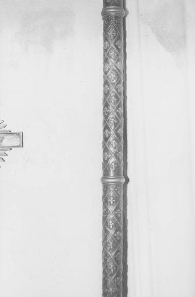 La hampe de la croix est en deux morceaux démontables. Le noeud indépendant, support du croisillon proprement dit, est en laiton doré assez finement ciselé. Le croisillon lui-même est argenté avec des fleurons dorés dont un manque au croisillon de droite. Un nimbe rayonnant entoure le Christ.
