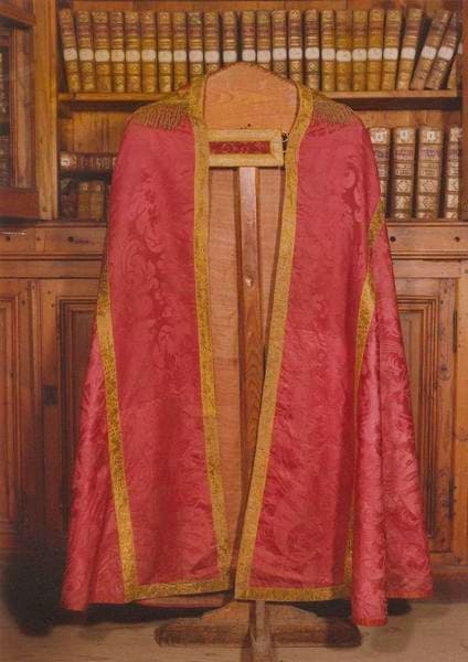 Cette chape de grandes dimensions en damas rouge représenterait un décor baroque italianisant. Le chaperon est souligné d'un large galon d'or avec frange d'or. Sur le devant, le galon forme orfroi. Décoration de fleurs et corne d'abondance.