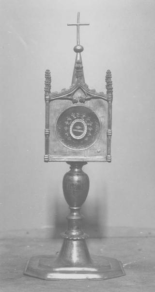 Ce reliquaire est en forme de chapelle montée sur un pied. La thèque forme donc un édicule presque cubique. Au centre d'une des faces est ménagée une grande ouverture circulaire, afin de laisser voir les reliques. Au dessus de la thèque s'élève un cône aigu terminé par une boule qui porte une croix formée de tubes étroits sans ornements. Le pied paraît plus moderne. Sa base est à huit pans.