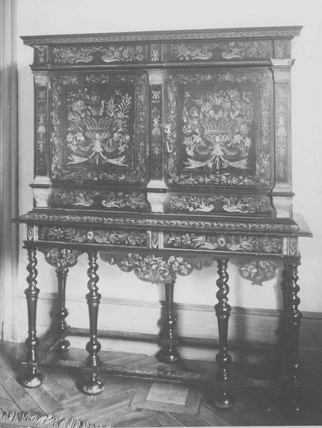 Sur la façade, deux grandes portes et quatre tiroirs. Le piétement compte quatre colonnes devant et trois derrière. L'intérieur ancien n'existe plus, sauf deux tiroirs.
