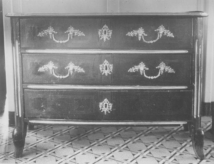 Commode Louis XIV à trois tiroirs. Une importante moulure en laiton entoure le dessus (dont la marqueterie a disparu). Il y a des gorges en laiton sur les deux angles et en dessous de chaque tiroir. IL manque les poignées du tiroir d'en bas.