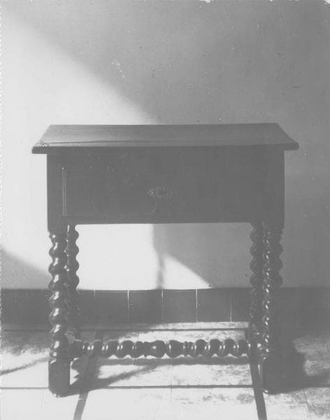 Petite table Louis XIII avec un tiroir. Pieds torses. Croisillon en H. Au milieu de la grande traverse, le torse est interrompu par deux vases adossés.