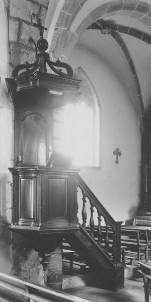 Au dessus d'un cul-de-lampe à six faces, la cuve présente en avant un panneau plat de menuiserie accompagné de deux colonnes cannelées et placé entre deux panneaux arrondis. Un panneau de menuiserie orné d'une moulure chantournée dans le haut, réunit la cuve et l'abat-voix. Ce dernier est orné de moulures et de denticules. Au dessus, six volutes soutiennet un globe surmonté d'une croix. Les barreaux de l'escalier ont des moulures qui suivent l'inclinaison de la rampe.