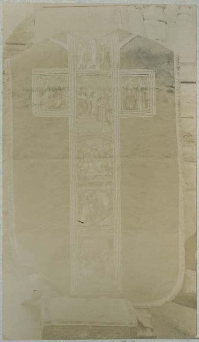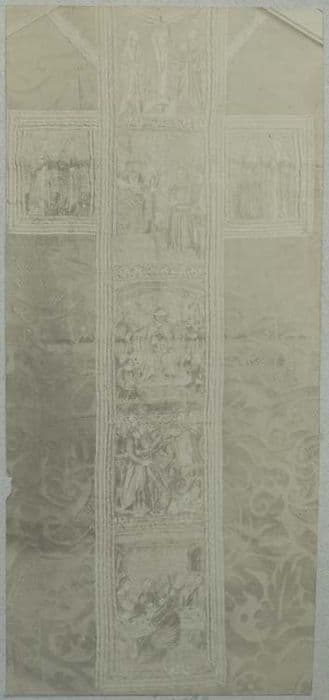 Chasuble représentant plusieurs scènes de la Passion. Broderie polychrome (orfrois) du 16e siècle, sur fond de soie du 18e siècle.