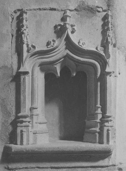 Sous une accolade, formée de quatre moulures et surmontée de quatre crochets et d'un fleuron, la niche s'ouvre assez profondément sous un arc trilobé. L'accolade s'appuie sur deux pilastres prismatiques surmontés de clochetons terminés par un fleuron. Un boudin assez saillant agrandit la table, amorti en dessous par un congé.