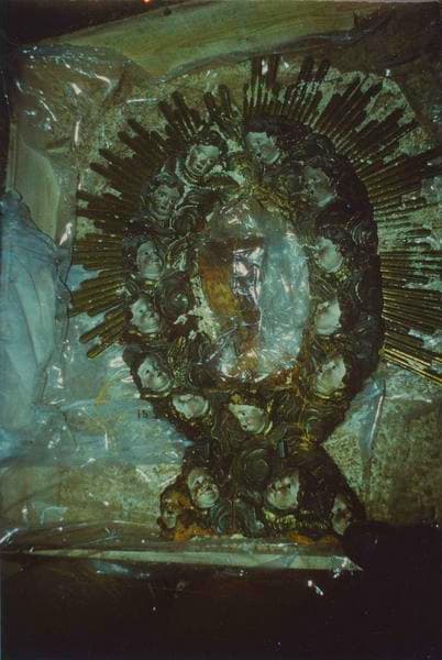 Le thème essentiel est celui de l'adoration de petits angelots, dont seules des têtes peintes au naturel émergent de feuillages eux-mêmes colorés tout autour de l'ovale dessiné par la composition.